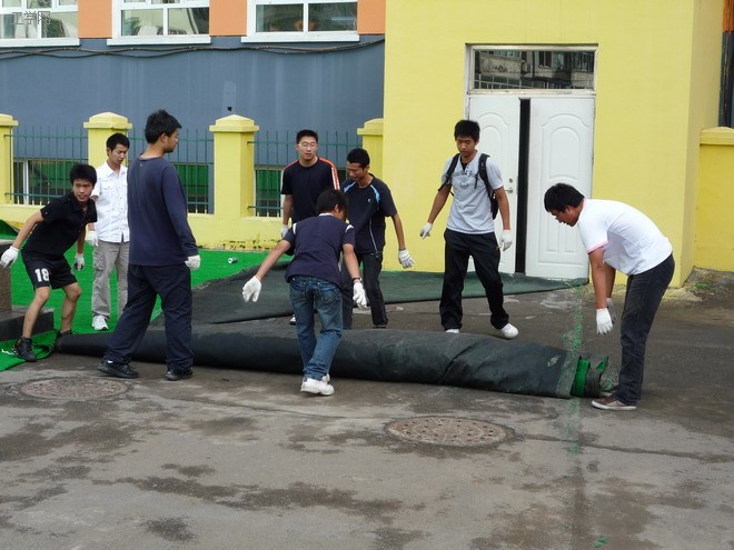 四时左右,服务队的一行人到达燎原小学。在燎原校方的引导下,服务队帮助小学生清理了校园环境。由于最近是雨季,粘在操场上的地毯由于长时间的曝晒导致风化,这给服务队整理时带来了不小的麻烦,最后在大家的互相勉励下,经过半个多小时。终于顺利完成了任务。