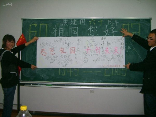 晚6点整,081021班全体同学齐聚启航。6:30分团活准时开始,在庄严的国歌声中,一面面国旗在同学们心中升起。一曲振奋人心的《大中国》拉开整个活动的序幕。活动开始后,同学们纷纷走上台前讲述发生在自己身边的变化,畅谈自己的感受,借此抒发自己对祖国的热爱之情。随后,“爱国知识竞答”、“20首红色歌曲歌名竞猜”等活动大大活跃了现场氛围。最后,有班委牵头,全班同学在一幅长条幅上签下自己的名字,以此来纪念伟大祖国诞辰60周年。