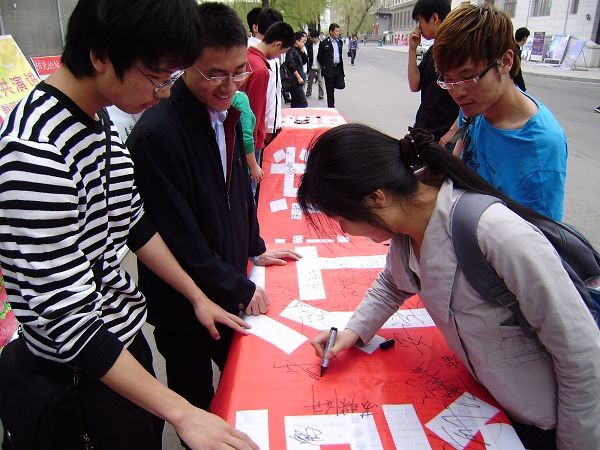 中午时分,涌动的人群被红色的条幅吸引,大家纷纷驻足留墨,表示对学校诚信教育的关心和支持。下午,组织人员将签满姓名的条幅在奥列霍夫广场展出,并向过往的学生讲解诚信的重要性,引起很多同学的共鸣和深思。