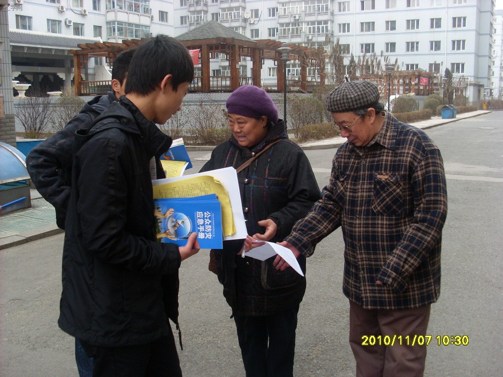 宣誓仪式完毕后,同学们来到了文化家园社区配合社区居委会以问卷方式对社区居民的消防安全知识普及情况进行了调查。期间,尽管气温很低,但同学们都都能以积极的心态参与此次活动,社区的现场气氛顿时活跃。调查完毕后,同学们向社区居民发放了普及消防安全知识的传单及手册,以增强社区居民的消防安全意识。本次活动得到了社区居委会的较高度评价。
