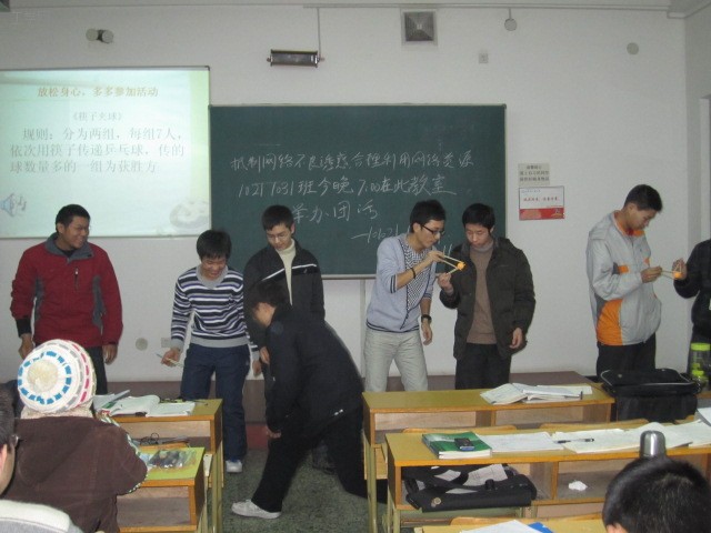 活动分为视频教育、思想报告、游戏互动三个环节,其中学生自己拍的视频轻松幽默,让同学们在欢声笑语中认识了网瘾的危害,过后的思想报告有形势分析、亲身经历,给同学们一些启发。在最后的游戏(夹汤圆)互动中,同学们互相帮助,体会到合作的乐趣。