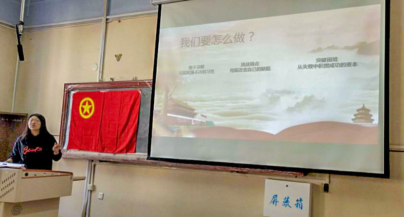 活动伊始,全体人员在班长王帅的带领下面向团旗庄严宣誓,洪亮的入团誓言体现出20181051班全体成员高昂的精气神。活动中冀晨提问大家时,全场气氛热烈,同学们踊跃回答。冀晨对回答进行总结,提醒同学们不要被繁华蒙住双眼,应始终如一地坚持梦想,并播放解读中国梦的视频,大家陷入沉思,在场气氛变得肃穆。了解到应该如何实现梦想后,在组宣委员熊盛的带领下,全体成员起立,学唱团歌。