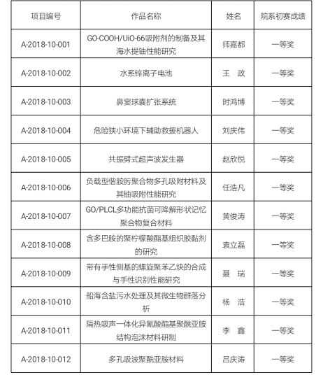 材化学院2018年度“五四杯”评比工作至2018年11月13日已全部完成。本着公开、公平、公正的原则,我院对参加结题答辩的107组创新训练项目进行严格评审,共评选出院系内一等奖18组,二等奖27组,三等奖37组,其中前12组(见下图)将代表院系参加“五四杯”决赛,具体信息详见附表1。