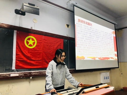 11月20日,团支书高菲开展的“以新气象新担当新作为推进东北振兴”日常团日活动于11号楼0124中教室进行。此次活动由20181053班全体学生参与,团支书高菲担任主讲,组宣委员付容担任摄影工作。
