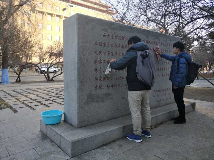 2018年12月14日上午八时,志愿者们准时于11号楼集合完毕,经夏宇轩的简单分配任务后,志愿们拿上抹布,盆子,接上水,在自己的所分配的区域上对中国人民解放军军事工程学院空军工程系旧址纪念碑进行了擦拭与清洁工作,工作有条不紊的展开。并在清洁纪念碑的过程中了解了我校的辉煌历史、回忆了先辈们往昔的峥嵘岁月、缅怀了先辈们的伟大成绩。