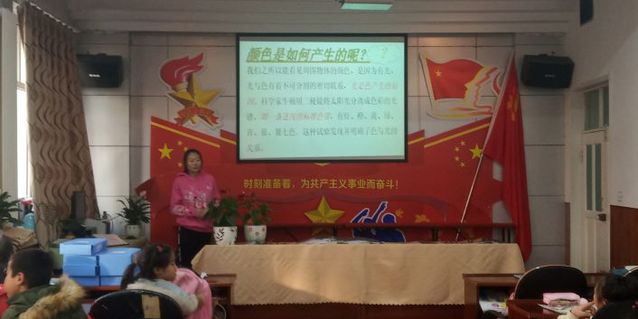 本次上课的主题是多姿多彩的世界,主讲人周以恒以PPT和实验的形式向小朋友们展示了有关颜色的奥秘。本次活动主要分为“颜色的产生”,“神奇的颜色”,“颜色与生活”三个部分,通过生活中的自然现象─彩虹,使小朋友们认识了彩虹的形成过程并引入此次活动的主题。上课期间,小朋友们不仅踊跃地回答问题,还积极地发表自己对颜色的看法观点。最后,主讲人通过实验带领小朋友们了解生活中有关颜色的现象。