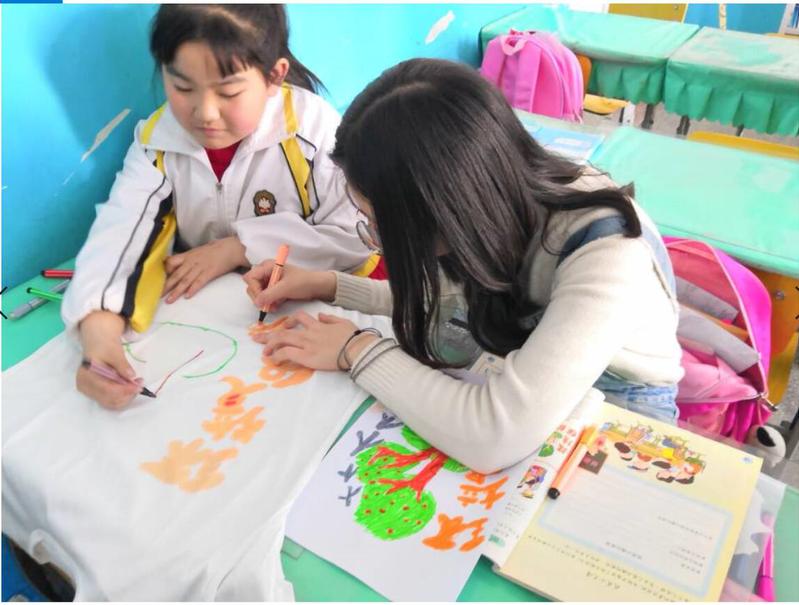 志愿者到达学府小学,与学校交接后,本次支教正式开始。首先主讲人向孩子们讲述现在中国水资源现状,并引领同学们思考节水小妙招,鼓励同学们积极发言,接下来志愿者与同学们一起完成节水主题短袖涂鸦,即如何以小组合作方式绘制以节约水资源为主题的涂鸦短袖。在孩子们画完草稿后,志愿者们对给学生下发短袖,并帮助学生进行短袖涂鸦。