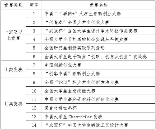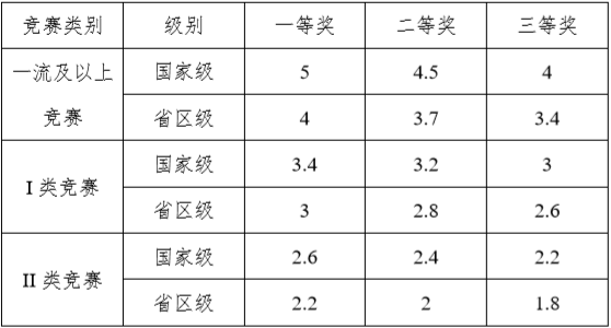 注:①以上获奖加分如参赛成员大于1人时,则参赛人员根据排序按照100%、75%、75%、50%、50%计算加分;②冠亚季军对应一、二、三等奖,特等奖按一等奖计算,地区级比赛按省级比赛计算,同一项目、同一比赛只取最高分;③研究生可参加的创新创业大赛。