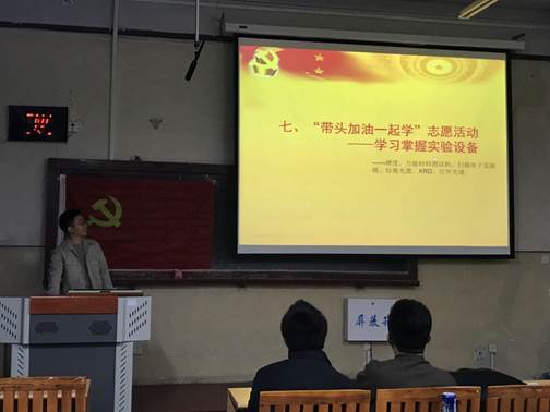 由卢显鹏、姚召定、邓鸿中、田雨萌、王鹏、陈禹鹏六位党员师兄分别为我们介绍了硬度、万能材料测试机、扫描电子显微镜、拉曼光谱、XRD、红外光谱的实验设备的使用方法及注意事项。