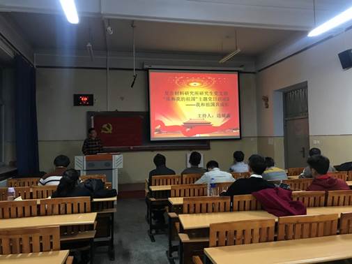 2019年10月24日,复合材料研究所研究生党支部全体正式党员在11#0151顺利召开了2019-2020学年第二次主题党日活动,主题为:我和我的祖国----我和祖国共成长。复合材料研究所全体学生党员参加此次大会。大会由复合材料研究所研究生党支部支部书记边城鑫同志主持。