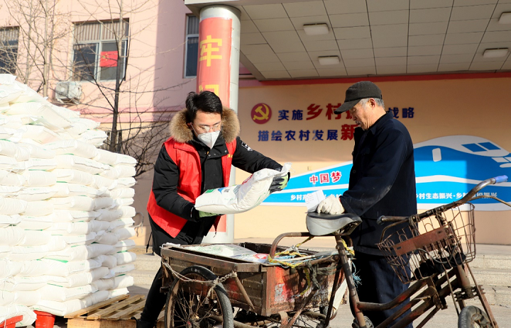 图为方子铭(左一)为社区工作人员拿取保暖物品