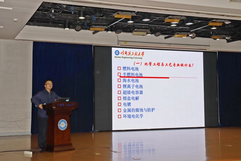 最后,王贵领教授详细地介绍化学工程与工艺这一专业。他讲到化学工程与工艺专业的学习内容、世界十大最新科技、我校电化学的发展历程与特色以及电化学工程专业与“三海一核”的关系。