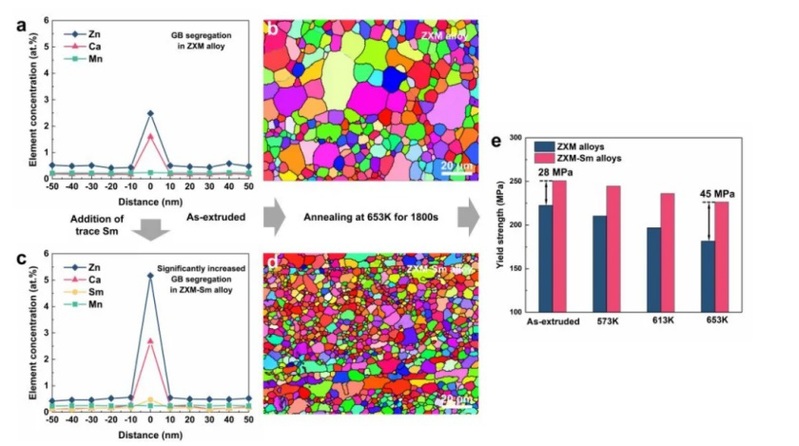 图2 (a)无稀土镁合金和 (c)含微量稀土镁合金的晶界偏聚含量 (b)无稀土镁合金和 (d)含微量稀土镁合金在相同退火条件下的晶粒长大情况 (e)不同退火状态下含/不含稀土镁合金的屈服强度