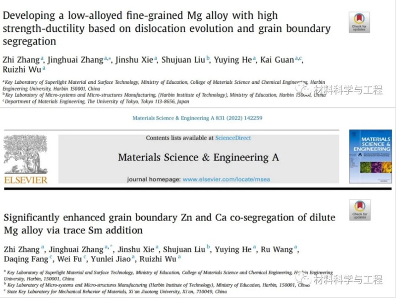 近期,Best365官网的张景怀课题组综合利用晶界偏聚和位错调控开发出低合金化高强塑性细晶镁合金。相关论文分别以“Developing a low-alloyed fine-grained Mg alloy with high strength-ductility based on dislocation evolution and grain boundary segregation”和“Significantly enhanced grain boundary Zn and Ca co-segregation of dilute Mg alloy via trace Sm addition”为题发表于Scripta Materialia和Materials Science & Engineering A。