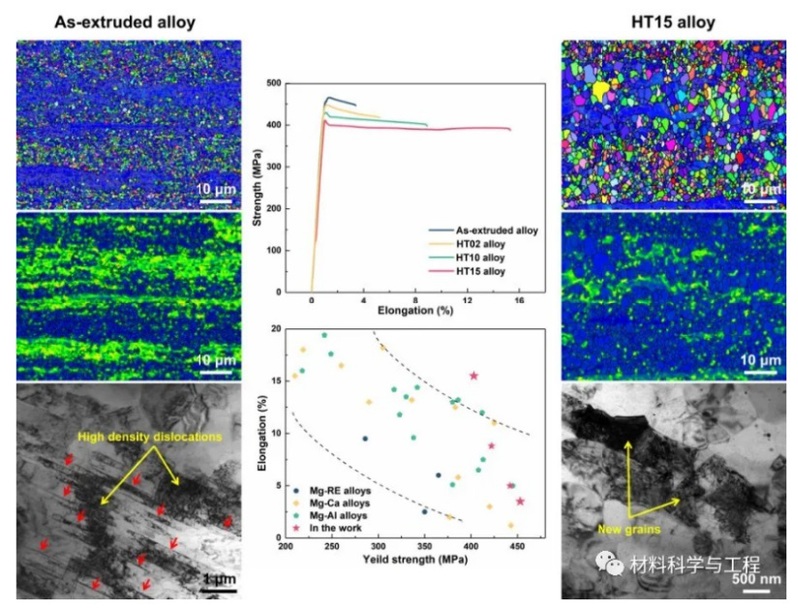 图3 挤压态合金和退火15min合金(HT15合金)的微观组织和力学性能。