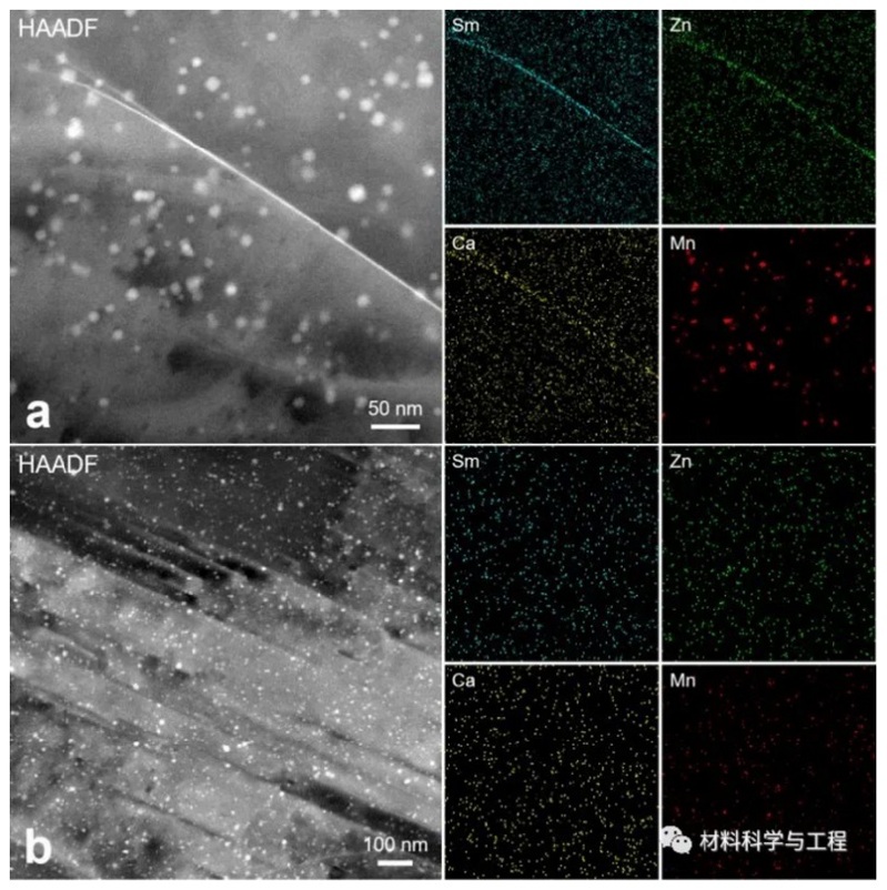 基于以上晶界偏聚研究,研究者通过合金化设计结合低温低速挤压+退火工艺,综合利用晶界偏聚和位错调控,提出一种开发低合金化高强塑性镁合金的新方法。首先,采用低温低速挤压工艺制备出超高强度低合金化Mg-2Sm-0.8Mn-0.6Ca-0.5Zn(wt%)合金,该挤压合金屈服强度达到453MPa,但塑性较差(延伸率仅3.2%)(图2),超高的强度主要源于挤压过程中形成的含有高密度残余位错和纳米锰沉淀的细晶结构。然后,协同考虑位错回复、静态再结晶和晶粒生长等因素,采用350°C作为退火温度,退火15分钟后的合金(HT15合金)表现出高强度和高塑性的优异组合,其中,屈服强度为403MPa,伸长率为15.5%(图2)。退火合金仍然能保持相当高强度的关键在于Sm/Zn/Ca元素的晶界共偏聚有效抑制退火过程中的晶粒生长(图3);另一方面,退火过程适当降低了位错密度,特别是不可动S-<c+a>位错向晶界的演化,是退火合金塑性显著提高的重要原因(图2)。(Scripta Mater. 209 (2022) 114414)