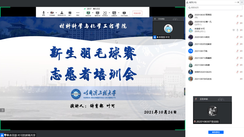 本次活动在学院各年级招募志愿者8名,并于1024日由体育部负责人叶可通过腾讯会议进行了线上培训,主要负责选拔赛秩序维护、签到、执裁等工作。