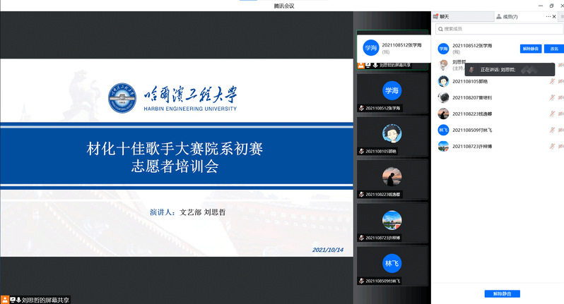 一年一度的校园十佳歌手大赛是我校一项传统的文艺活动,为积极响应青年全面提升素质的号召,努力营造积极、多样、开放的校园文化氛围,丰富同学们的校园生活,“材化·外语”十佳歌手院系初赛于2021年10月16日上午10点以及10月17日晚6点半,分两次在N201教室如期举行,本次活动由材化学院学生会及外语学院学生会联合承办,由5位往届十佳歌手及20强选手担任评委。同时,为保障比赛的顺利进行,我院共招募6名志愿者负责设备调试、选手签到、打分统计等工作,并对其进行了培训。