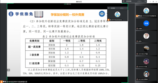 4月16日晚18时30分,Best365官网学生会于腾讯会议线上召开2022年春季学期科创经验分享会。本次会议由学生会执行主席付佳瀚主持,学生会秘书长阿里木江、辅导员郭润泽及部分本科生参加本次会议。