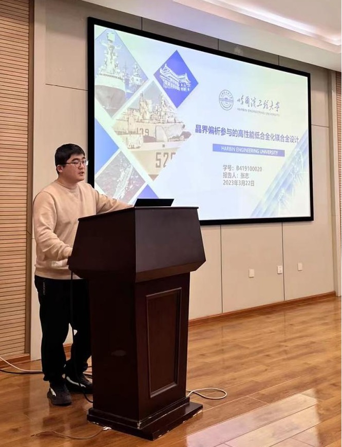张志博士主要从事镁合金微观组织、力学性能和变形机制的研究。博士研究阶段以第一作者身份在高水平SCI发表论文6篇,授权国家发明专利1项,论文单篇最高引用100次,曾获得IJMMM期刊优秀论文奖。张志博士以《晶界偏析参与的高性能低合金化镁合金设计》为题做报告。本次报告以晶界偏析调控微观组织为主线,以设计高性能低合金化镁合金解决现有问题为核心,系统介绍了镁合金方面的知识。