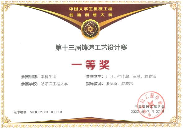大三学年有幸和一群志同道合的朋友组成团队,代表学校参加材料学科重要赛事“第十三届铸造工艺设计赛”。对于工艺优化来说,没有最好,只有更好。我们经常聚在研讨室,有时一起学习理论知识,互帮互助,有时设计、建模、仿真,各司其职。几个月的基础学习,几十小时的仿真计算,几十次模拟答辩,都源于我们对完美方案的追求。功夫不负有心人,最后我们以答辩第一,总分第一的成绩获B组工件国家一等奖第一名,实现了学院、学校在该赛事中一等奖零的突破,取得最佳成绩。