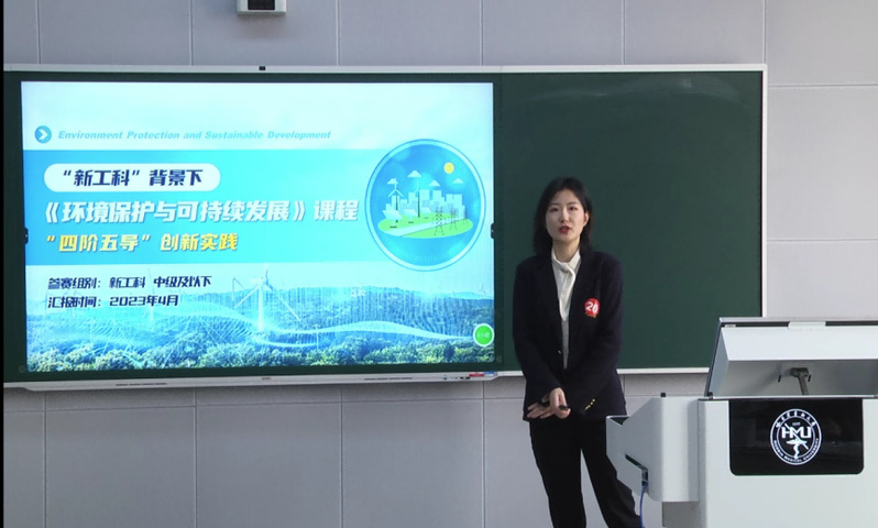 《环境保护与可持续发展》课程秉承落实我校“三个第一”价值追求,立足服务工程教育,深度把握“人与自然和谐共生”的可持续发展内涵,以建立学生生态文明意识为基础,培养学生可持续发展工程能力和跨行业创新思维为目标,开展了“新工科”背景下课程的“四阶五导”创新实践。材化学院课程主讲教师丁鹤以及《环境保护与可持续发展》教学团队在教学过程中凝炼了课程的“双核”思政体系,建立了“新工科”案例库和“1+N”专业协同网络模块,提出“五导链式”教学法(“导入、导思、导学、导衍、导出”),通过采取“全面培养、积极参加、重点选拔”的实践培育机制,扩大了创新平台资源和社会实践空间,实现了学生“知识深度-工程应用-实践能力-创新思维”的综合培养。