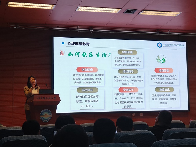 材化学院党委副书记刘立静与2023级研究生交流了在校期间的日常行为习惯养成、心理情绪调适及防电信诈骗、坚守学术诚信底线和科研保密红线、榜样引领等方面的内容。她从同学们的个人卫生保持开篇,引导同学们养成讲卫生、勤收拾的好习惯,保持健康生活。而后,她又向大家普及了“十个凡是”、“三不一要”等防诈骗技巧,叮嘱同学们不轻信、不转账,看好自己的“钱袋子”。紧接着,刘立静以反面典型案例为引,告诫同学们红线底线不可碰,要做一个对祖国忠诚,对科研负责的学生。随后,刘立静从研究生期间“为何烦恼”展开,逐一提出调节方法和应对建议。最后,刘立静通过展示学院国家奖学金获得者以及优秀毕业生的学生事迹,寄语同学们向榜样看齐,激发同学们的进取之心。