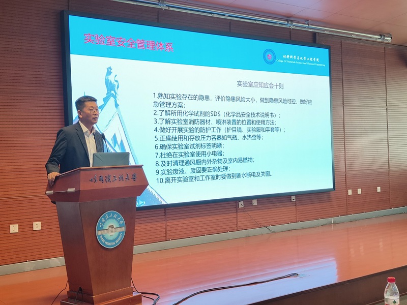 副院长李峻青向2023级研究生介绍实验室安全管理体系,通过普及实验室安全知识,他重点讲解了材化学院《实验室应知应会十则》,从十个方面全方面向同学们介绍了实验过程中的应知应会和令行禁止。他表示,安全无小事,通过详细的讲述,希望同学们加强自身的安全防范与自我保护意识,积极养成良好的实验习惯,在实验过程中按规操作,切勿大意,防止实验室安全事故的发生。