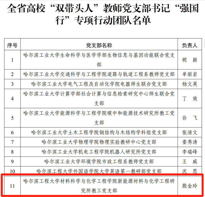 近日,黑龙江省委教育工委公布了全省高校“双带头人”教师党支部书记“强国行”专项行动团队遴选结果,我院新能源材料与化学工程研究所教工党支部成功入选。