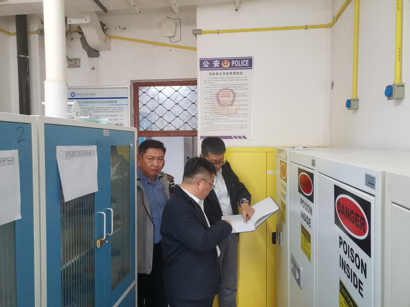 严汝建一行通过走访实验室、与师生员工交流等形式,对学院危化品安全管理、消防安全、实验室安全教育培训等方面工作进行了现场检查。严汝建指出学院要加强危险化学品的安全管理,要严格做到购买、储存、使用以及最后危废处理的安全全过程闭环管理,严防事故发生,保障校园安全稳定。严汝建强调学院要加大力度落实师生员工的安全教育培训,定期组织相关师生的安全学习和技术培训全覆盖,提高师生的安全管理意识和安全技能。