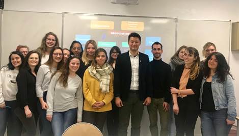 董博士用法语为法国研究生授课,内容涵盖了西欧与亚洲特别是与中国的跨文化沟通和交流的特点与案例,中国更加开放的国际市场和“一带一路”倡议,中欧间文化语言习惯、社会、风土人情异同,双方基于文化认同、文化融合和求同存异互利共赢原则展开国际商务谈判的战略理念和经验案例等,教学注重实际案例的互动交流,激发学生们踊跃提问,让法国学生对于跨文化交流与合作有了全新的认识和理解,获得了法国校方的高度肯定和同学们的热烈掌声,被赞誉“这就是学校希望开设的国际商务课程”。