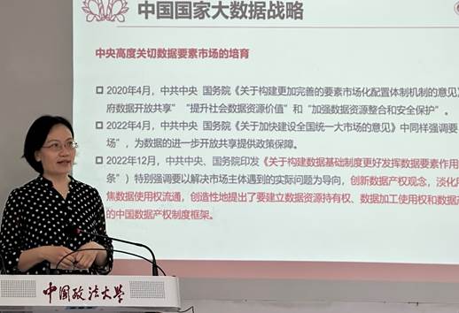 接着,李老师详细介绍了中共中央、国务院印发的《关于构建数据基础制度更好发挥数据要素作用的意见》(简称“数据二十条”),其核心要点是建立四大数据基础制度,一是建立保障权益、合规使用的数据产权制度;二是建立合规高效、场内外结合的数据要素流通和交易制度;三是建立体现效率、促进公平的数据要素收益分配制度;四是建立安全可控、弹性包容的数据要素治理制度。“数据二十条”以解决市场主体遇到的实际问题为导向,聚焦数据使用权流通,对于激活数据要素潜能,做强做优做大数字经济,构建中国特色数据产权制度体系具有重要意义。