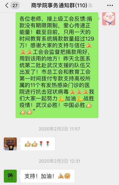面对疫情,院工会发出倡议,组织教职工向湖北疫区自愿捐款,募捐由北京市温暖基金会直接对接湖北省总工会,直接对接到武汉相关医院及其医务人员,爱心传递正能量!仅用一天的时间教育系统捐款数量超过129万,北医系统两批赴武汉支援的队伍出发,市总工会和教育工会第一时间拨付专款支持高校所属的11个有发热感染门诊的医院进行抗击冠状病毒,爱心传递,大爱无疆!截至2月3号,北京教育系统捐款共计3859544.18元,22021名教职工颗颗爱心,其中必赢官网有十几名教师通过校工会渠道捐款。温暖武汉,汇聚力量,战胜疫情!感谢老师们的祝福与支持!
