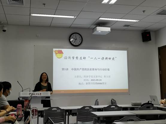 2021年9月23日上午,经济学党支部在学院路校区新图书综合楼0506教室举办“一人一课讲‘四史’”学习活动。本次活动由经济系周敏丹老师主持,经济系副主任黄立君老师领学,主题为学习《中国共产党的历史使命与行动价值》一书。经济学支部的教师党员,部分政治经济学、西方经济学专业的硕士生党员和入党积极分子也参加了本次学习。