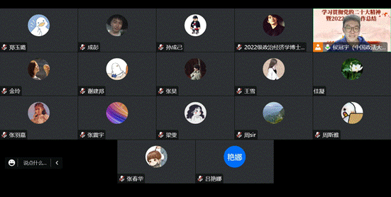会上,2019级政治经济学成彭博士、2022级创新经济学博士生张昊和2022级创新经济学博士生王雪分别进行了求职经验和理论学习交流发言。
