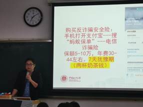 首先,保卫处李伽老师就近期发生的校园诈骗实际案例进行反诈宣传,结合刷单、网聊、网络购物等典型电信诈骗手段,提示同学们提高安全意识,谨防校园诈骗。