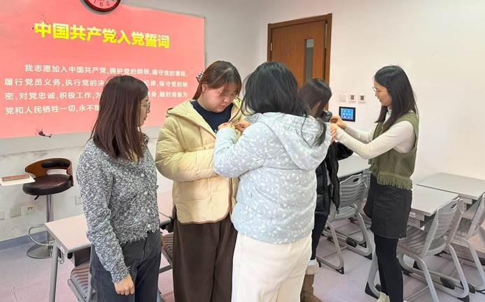 紧接着入党介绍人为预备党员佩戴党徽,三位预备党员表示将认真学习党的理论知识,不断提高自己的政治觉悟和政治能力,锤炼意志品质和综合素质,始终保持党员的先进性和纯洁性,发挥好党员的先锋模范作用。