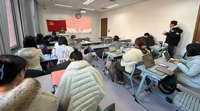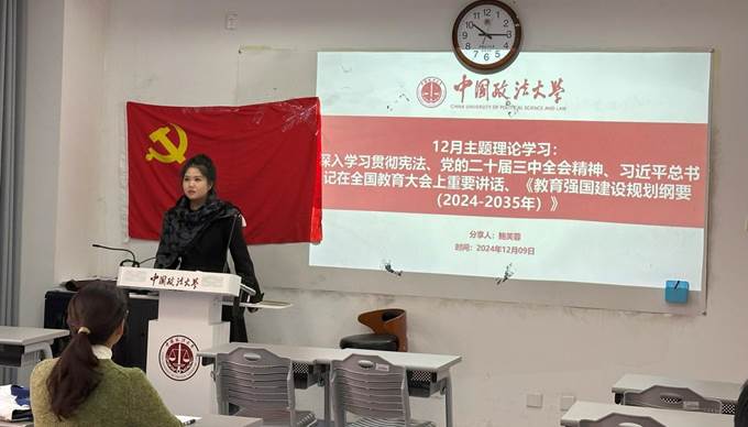 会议第一阶段为12月理论学习,主讲人为2024级博士生鲍芙蓉同志。鲍芙蓉同志为大家梳理了宪法、党的二十届三中全会精神、习近平总书记在全国教育大会上重要讲话、《教育强国建设规划纲要(2024-2035年)》的重点内容,从学习与实践的角度出发,提出要深刻认识教育在党和国家事业发展中的基础性、先导性、全局性作用,注重自身教育素养的提升,发挥党员的先锋模范作用。