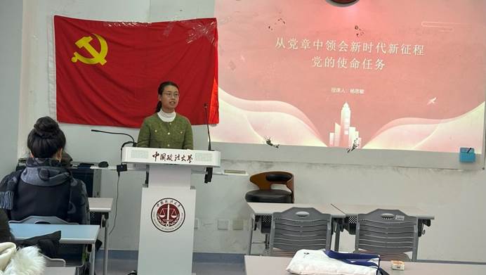 入党积极分子徐达提到,张晋藩先生不仅为我国法制史学科奠定了理论基础和结构范式,也为我国法学教育事业培养了诸多优秀的人才,作出了卓越贡献。经济史、法制史均是其热爱的研究领域,作为“法大人”和“烟大人”,希望通过自己的努力传承这份珍贵的渊源,以张晋藩先生为榜样,为推动学科建设贡献自己的一份力量。