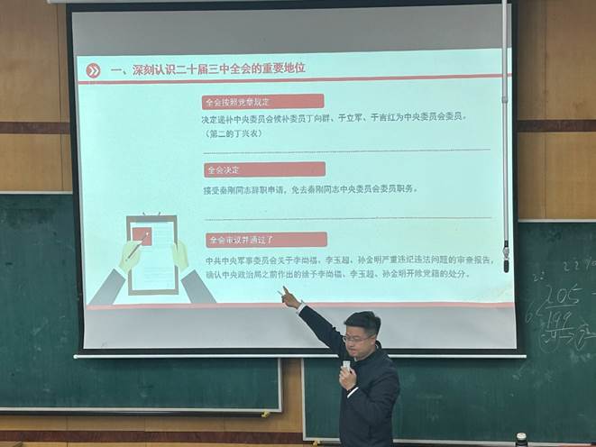 学习会尾声,第一党支部书记王晓曦总结道,本次会议从党史的角度出发,对中央历次党代会进行了系统梳理,使大家清晰地看到了我们党的成长轨迹与决策智慧。同时,借助落马干部的反面教材以及对党的二十届三中全会的深入剖析,充分彰显了党中央反腐肃纪、深化改革的坚定决心与强大魄力,希望全体学员能够从党史中汲取奋进的养分,紧密结合反腐警示,深入钻研党的二十届三中全会精神,并将所学转化为日常的点滴行动,勇当先锋模范,以青春热血投身于党的伟大事业,助力中华民族伟大复兴的中国梦成为现实。