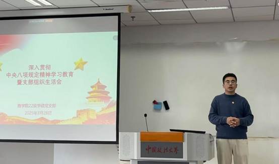 2025年3月28日,商学院22级学硕党支部组织召开了深入贯彻中央八项规定精神学习教育暨支部组织生活会。会议由党支部书记张国栋主持,支部党员、发展对象及积极分子参会。
