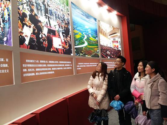 走进展厅“中国在繁荣进步”,面对几块描述中国经济快速增长、人均收入增长、贫困人口减少的数字图表,预备党员们感到无比自豪,为祖国的进步和人民生活水平的不断提高感到兴奋,心里的暖流也将恶劣天气带来的寒意一扫而光。