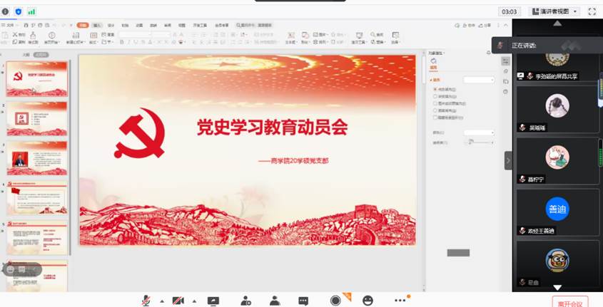为了响应习近平总书记的号召,全面动员同学们进行党史学习教育,商学院20级学硕党支部于2月27日下午4点在腾讯会议上开展了线上“党史学习教育动员会”的主题党日活动。参加本次活动的有20级学硕党支部党员8人,积极分子以及递交入党申请书同学,共计31人。