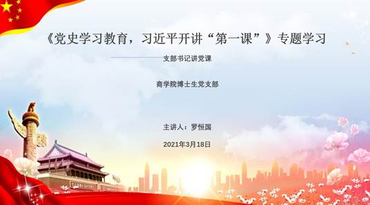 2021年3月18日晚上21:00,商学院博士生党支部书记罗恒国通过腾讯会议线上为党支部成员讲授党课《党史教育,习近平开讲“第一课”》的专题学习。