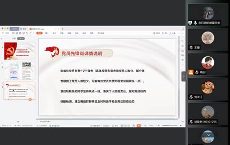 鉴于当前疫情形势较为严峻,学校周边疫情隐匿传播风险较高,商学院22级工双四支部响应上级号召,于2022年11月22日晚展开腾讯线上会议进行党员先锋岗动员大会,调动支部成员为大家服务的积极性,发挥党员先锋模范作用。