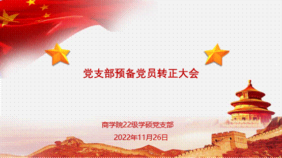 2022年11月26日,商学院2022级学硕党支部召开预备党员转正大会,本次会议由支部书记张国栋主持,辅导员李琼华老师及全体支部党员参加大会,会议主要讨论了关于丁怡、曾恩童两名预备党员同志转正的相关事宜。