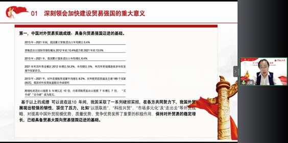 接着,张文英以《加快建设贸易强国》为题,分别从深刻领会加快建设贸易强国的重大意义、基本内涵、主要任务等角度论证了加快建设贸易强国的重要方式。我们要深入贯彻党的二十大精神,加强党对建设贸易强国的全面领导,提高贸易发展质量和效益,培育贸易竞争新优势,增强贸易发展新动能,积极参与国际经贸规则制定,为服务党和国家工作大局作出更大贡献。