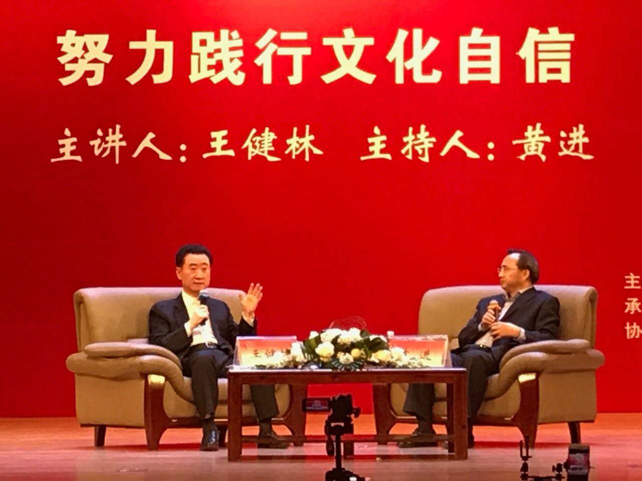 在热烈的掌声中,本次报告会主讲嘉宾、万达集团董事长王健林先生登台发表演讲。在半个小时的演讲中,王健林从习近平总书记关于“文化自信”的论述出发,结合万达践行文化自信的经验和事例,阐述了中国为什么需要文化自信以及如何增强文化自信。