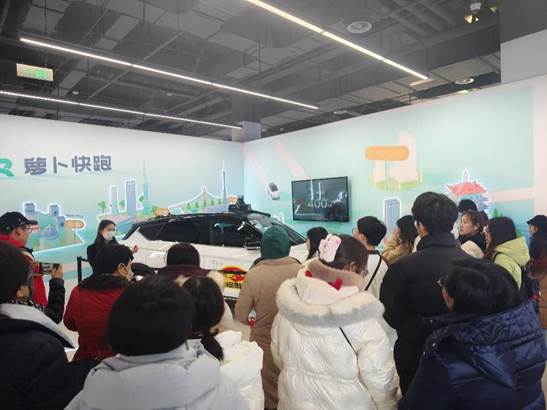 上午九点三十分,师生参观团抵达了百度Apollo Park。一部分师生先行前往无人驾驶网约车进行试乘,另一部分则首先来到百度Apollo用户体验中心。在这里,师生观看了百度关于无人驾驶的宣传片,专业讲解员对无人驾驶技术及发展做了简要介绍。