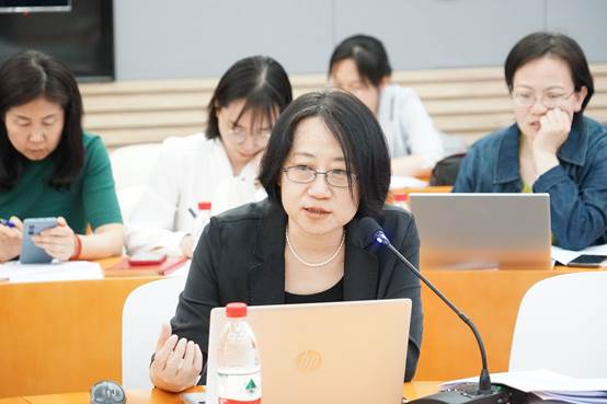 接下来,工商管理系主任郭颖教授就工商管理学科的评估报告进行了陈述,内容涵盖了师资队伍、思政建设、学术训练和成效等多个方面,并展示了工商学科在国家级课题、社会服务等方面的成果。同时,她也指出了在报告撰写过程中所遇到的一些问题,如篇幅字数的把控、成果部分的展示方式以及人员与成果的对应关系等。法商系副主任华忆昕副教授、会计系副主任何顶老师就工商管理一级学科学位授权点的评估报告进行了补充说明,并表示会积极配合本专业评估报告的撰写工作。